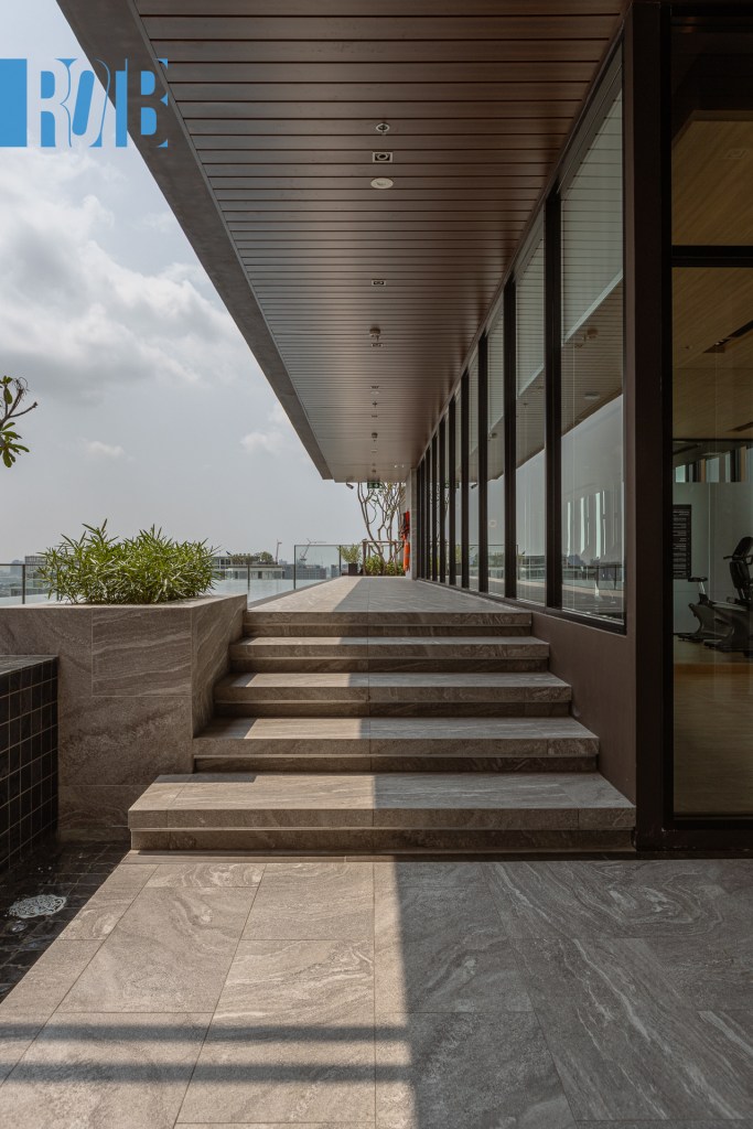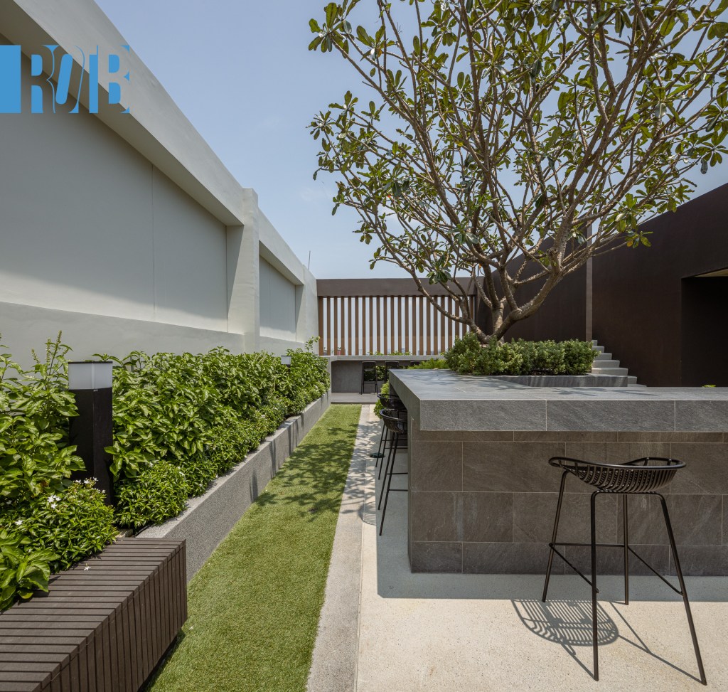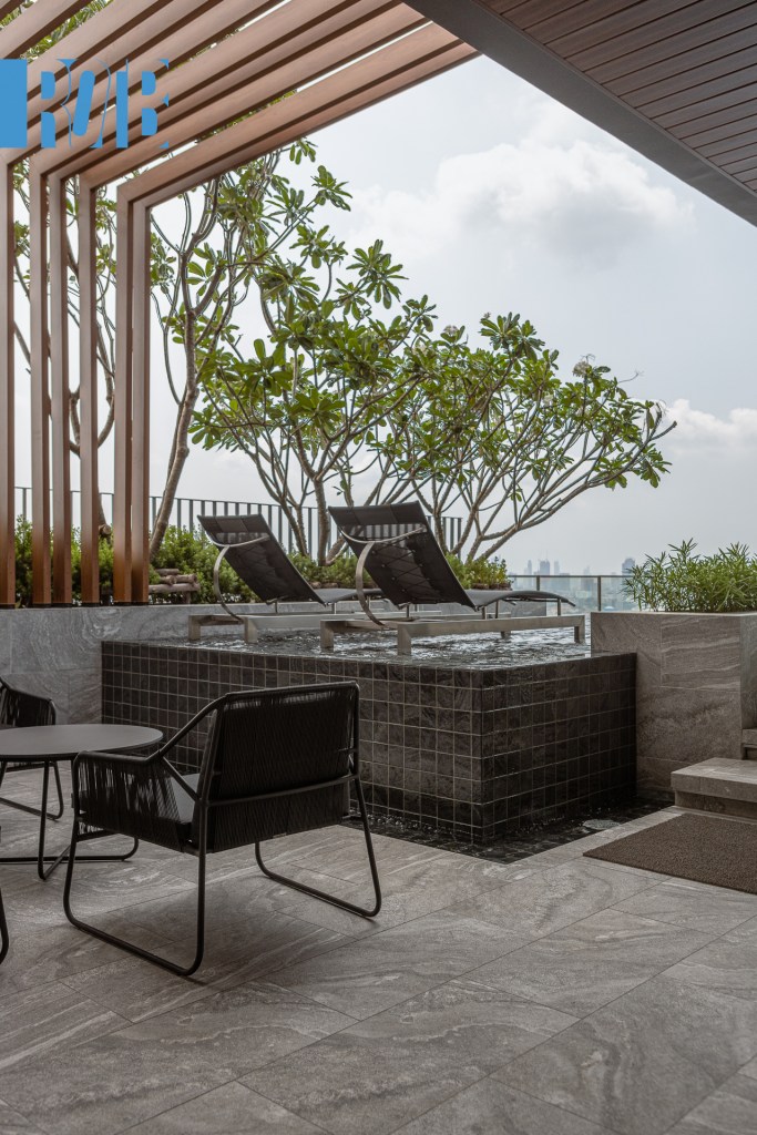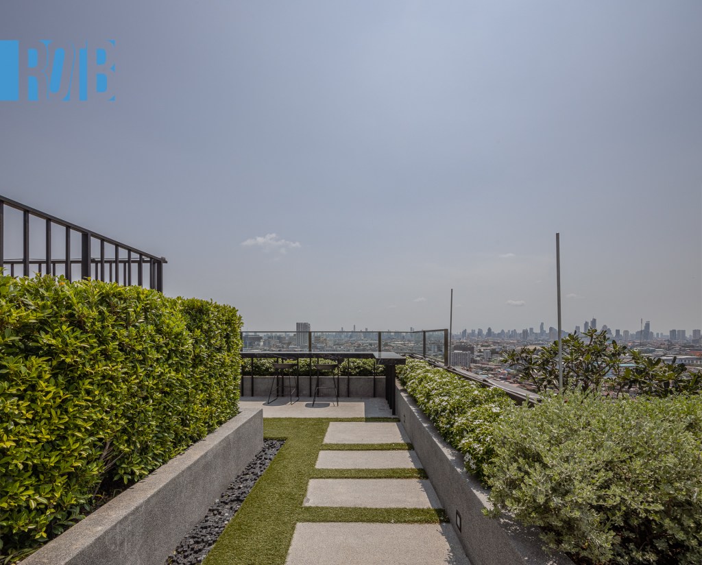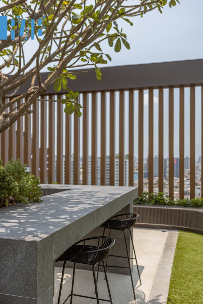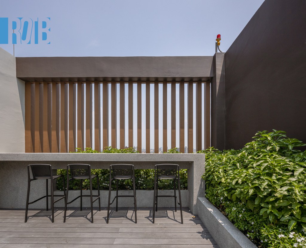 ชั้น 22 ไม่ได้จบแต่เพียงเท่านี้ จากสวนและแปลงผักที่เรากล่าวถึงเมื่อครู่ มีทางขึ้นไปด้านบนเป็นชั้นหลังคาของอาคาร Skyview Garden เป็นอีกพื้นที่สีเขียวของโครงการ แบ่งโซนชวนชิลเป็น 2 บริเวณ ได้แก่ เคาน์เตอร์บาร์และที่นั่งเอนหลัง โดยทั้งสองหันหน้าไปทางทิศตะวันตกหรือฝั่งพระนคร ซึ่งอีกฝั่งของบริเวณเชื่อมต่อกับทางลงไปสระว่าน้ำอีกด้วย