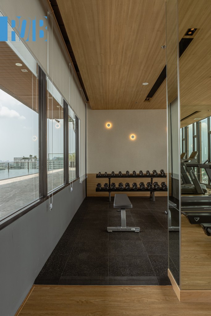 แม้จะอยู่ชั้นเดียวกันกับส่วนกลางบริเวณอื่น แต่พื้นตรงสระและผิวน้ำถูกยกขึ้นมาจากระดับความสูงเดิมพอประมาณ ความเท่นี้จะถูกสังเกตเมื่อมองจากห้องออกกำลังกาย High Energy Club ที่วางขนานกับสระน้ำ เมื่อมองไปทางสระว่ายน้ำจากห้องนี้ คุณจะเห็นผิวน้ำใกล้ระดับสายตา แต่เมื่อหันอีกด้านวิวที่ได้เป็นอีกเรื่องโดยสิ้นเชิง กล่าวคือเมื่อคุณว่ายน้ำ ตึกสูงใหญ่จะเป็นฉากหลังไกล ๆ แต่เมื่อคุณวิ่งบนลู่หรือเล่นโยคะ ทัศนียภาพกลายเป็นชานเมืองชวนสบายตา