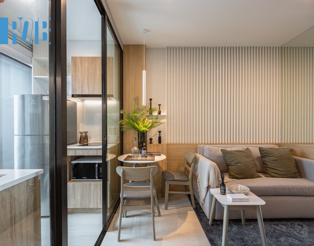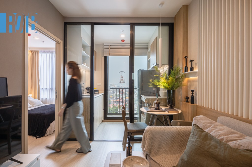 ห้องถัดมา 1 Bedroom M 26.ตร.ม โดยขนาดดังกล่าวมีให้เลือก 2 แบบ ได้แก่ครัวเปิดและครัวปิด โดยห้องที่เรากำลังพาไปเป็นแบบครัวปิด หลังประตูจะพบห้องนั่งเล่นและห้องครัวที่ถูกกั้นแบ่งสัดส่วนกันชัดเจน ถัดจากบริเวณโซฟาเป็นโต๊ะกินข้าว ส่วนถัดจากห้องครัวเป็นระเบียง ประตูซ้ายมือเชื่อมกับห้องนอนและห้องน้ำ