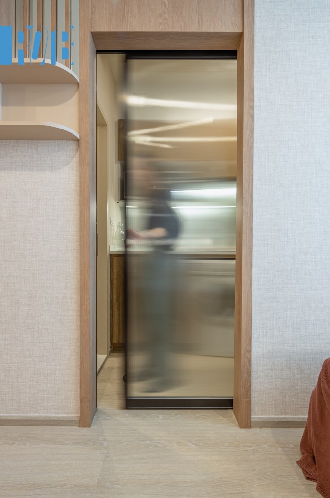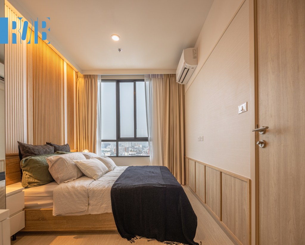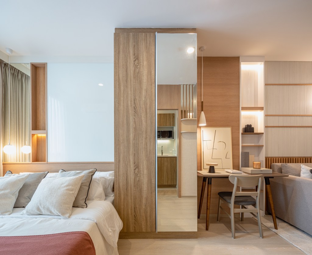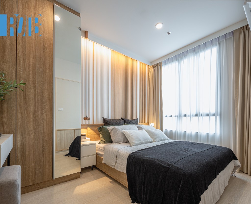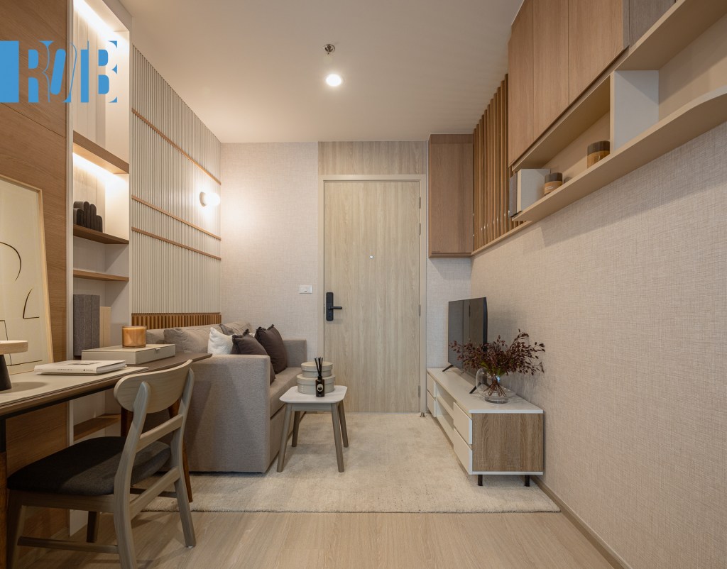 ห้องแรก 22.5 ตร.ม หรือขนาดเริ่มต้นของโครงการ แม้พื้นที่จำกัดแต่การจัดวางทำได้ลงตัว เมื่อเปิดประตูมาก็พบบริเวณห้องนั่งเล่น ถัดมาคือโต๊ะทำงาน ตู้เสื้อผ้า และเตียงนอนเรียงกันเป็นตอนลึก ซึ่งเฟอร์นิเจอร์ก็พร้อมใช้งานอย่างที่กล่าวมา ประตูด้านซ้ายมือเชื่อมไปยังห้องครัวและห้องน้ำ กั้นด้วยประตูบานเลื่อนโปร่งแสง บริหารพื้นที่ได้อย่างดีเยี่ยม